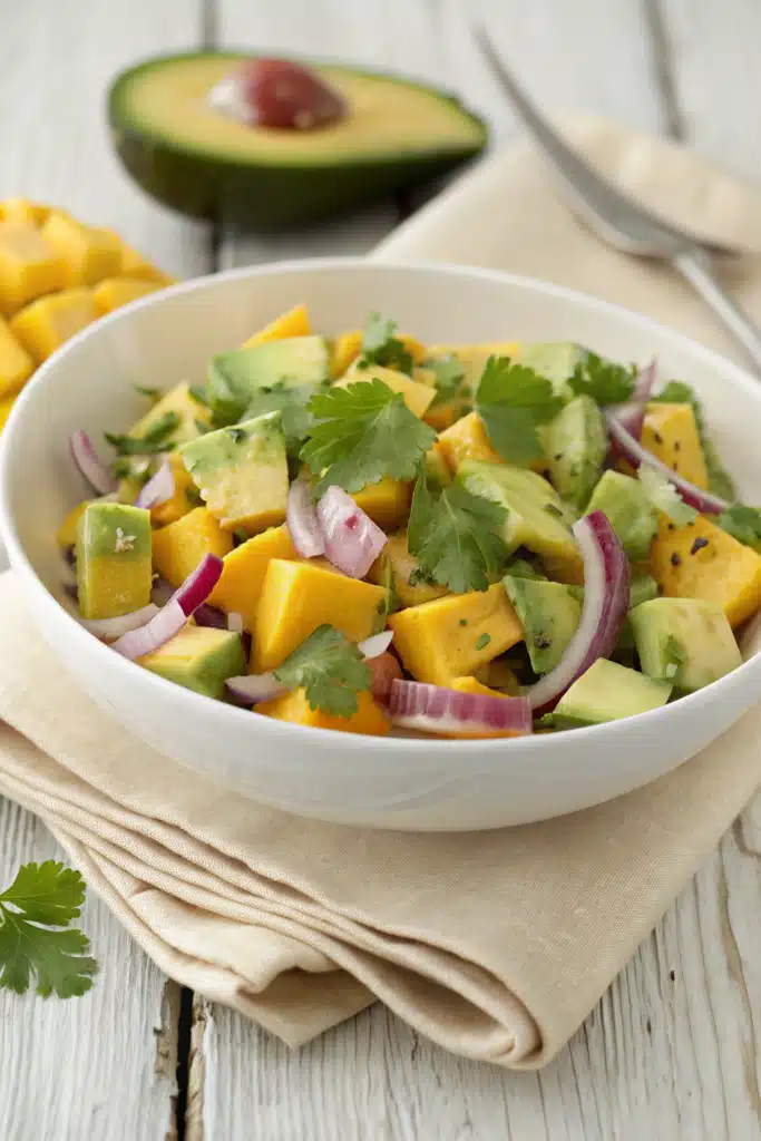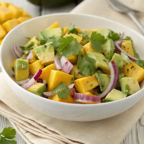 This salad comes together in just 10–15 minutes and requires no cooking. You’ll dice mango and avocado, thinly slice red onion and jalapeño, chop fresh cilantro, and whisk together a simple lime dressing. Toss everything gently to keep the avocado from turning to mush, and serve immediately. It’s best fresh, but if you must store it, press plastic wrap directly onto the surface to slow browning.