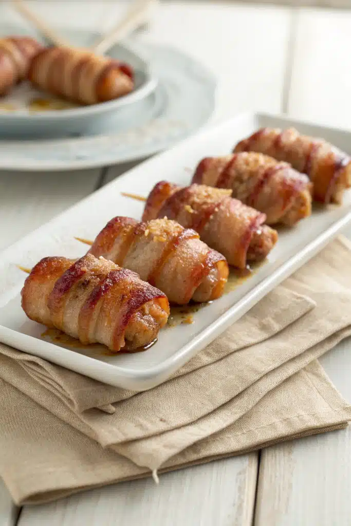 Bake for 25–30 minutes, flipping halfway through, until the bacon is golden brown and reaches an internal temperature of 165°F. If using a glaze, brush it on during the last 5 minutes for extra shine and flavor. Let cool slightly before serving—they’re best enjoyed warm but not too hot!