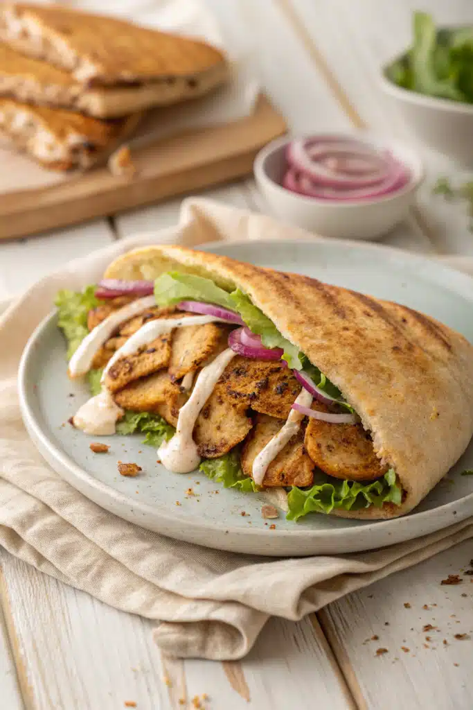 - Slice and serve in warmed pita bread with tahini sauce, garlic sauce, pickles, or fresh vegetables.