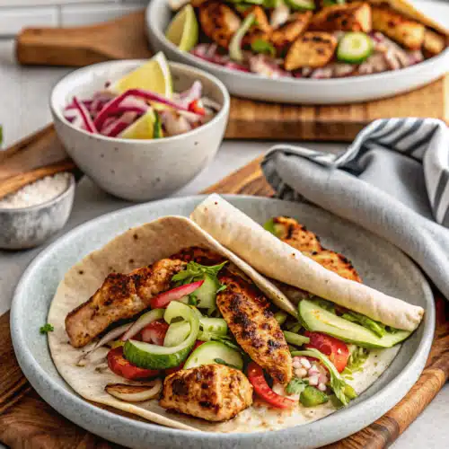 If you’re going classic, nothing beats soft pita bread stuffed with sliced cucumber, red onion, pickles, and a generous drizzle of creamy yogurt or tarator sauce. But honestly, I also love serving it over spiced rice—try it with jeera rice or Mediterranean-style grains topped with fresh herbs. For a low-carb option, pile the chicken onto lettuce cups with hummus and tomato salsa. And if you’ve got leftovers? They reheat beautifully in the oven at 350°F, keeping that satisfyingly tender texture.
