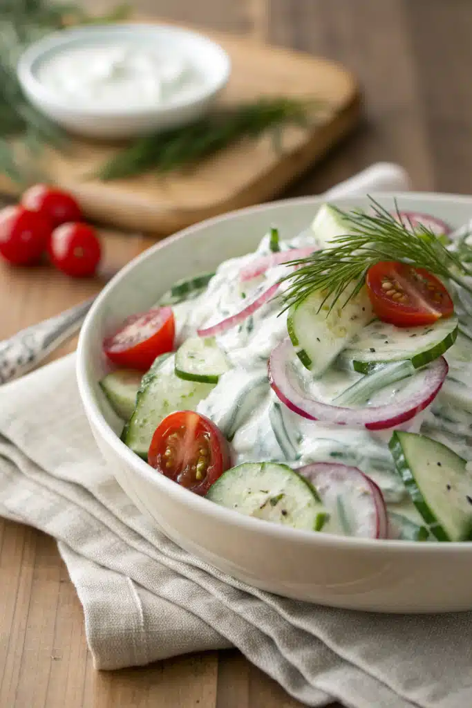 This creamy cucumber salad isn’t just another veggie side—it’s a whole experience. First off, it comes together in under twenty minutes, making it ideal for busy weeknights or last-minute entertaining. But what really makes it special is how versatile it is. Serve it cold on a scorching afternoon, or warm it up slightly if you’re pairing it with grilled sausages or roasted chicken. I also love how forgiving it is—if you don’t have sour cream handy, Greek yogurt works beautifully. And let’s talk flavor: the marriage of sweet, sour, and herbal notes hits all the right spots without overwhelming your palate. Plus, cucumbers are hydrating, low-calorie, and full of antioxidants, so you can feel good about serving it to guests who might otherwise reach for something heavier. Honestly, once you try this version, plain ol’ sliced cucumbers will never cut it again.