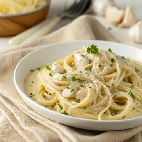 Garlic parmesan pasta is a simple yet luxurious Italian-inspired dish that combines al dente pasta with a velvety sauce made from butter, fresh garlic, heavy cream, and plenty of freshly grated parmesan. Unlike heavier cream-based pastas that rely on roux or flour, this version gets its silky texture from reduced cream and starchy pasta water—making it both elegant and weeknight-friendly. The key is letting the garlic infuse the butter gently so it’s fragrant but never bitter, then building layers of flavor with high-quality cheese and a splash of pasta cooking water to tie everything together. It’s comfort food at its finest: unpretentious, deeply flavorful, and impossible to resist.