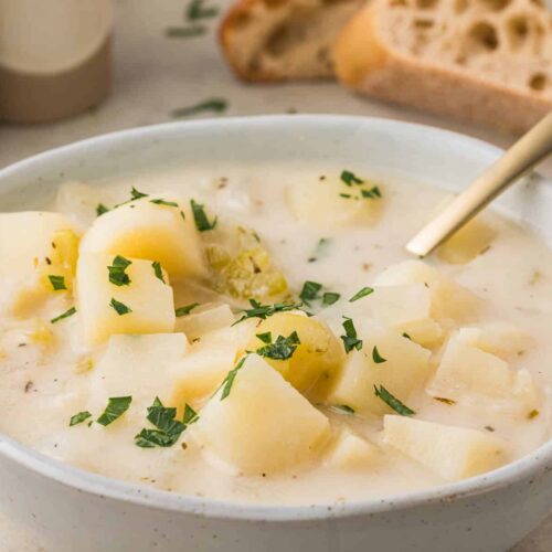 In under half an hour, you’ll have a restaurant-quality soup at home. Start by boiling cubed potatoes with onions, celery, salt, pepper, and savory in water until tender. Then blend in cream, buttermilk, and a cornstarch slurry to thicken. Finish by garnishing with parsley and serving piping hot. It’s that simple!