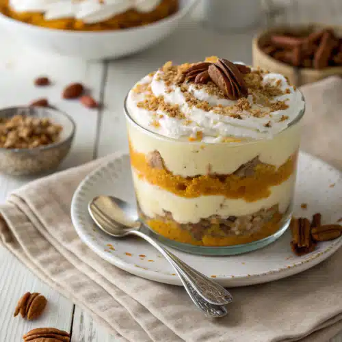 A pumpkin trifle is a decadent no-bake dessert made by layering spiced pumpkin custard, whipped cream, and crunchy pie crust or sponge fingers in a glass bowl or serving dish. Each spoonful offers a delightful contrast between silky smooth custard, airy whipped topping, and slightly sweet crumble—all infused with classic fall spices like cinnamon, nutmeg, and cloves. Unlike traditional trifles that often use jam or fruit, this version celebrates pumpkin puree as the star, making it ideal for Thanksgiving, harvest parties, or any occasion when you want to showcase autumn’s bounty.