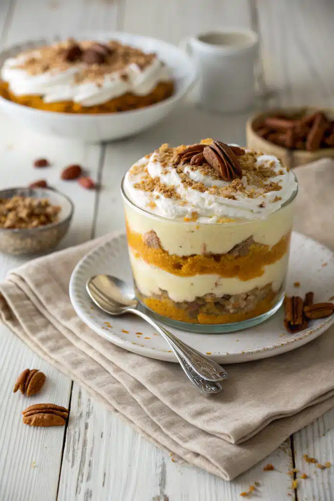 Pumpkin trifle shines best when paired with beverages that complement its warmth and richness. Serve it alongside black coffee, chai tea, or hot apple cider for a quintessential fall pairing. For adults, a splash of bourbon or amaretto stirred into the whipped cream adds a sophisticated twist. On the table, it looks lovely next to savory dishes like roasted turkey or sage stuffing—don’t forget the pumpkin pie for backup!