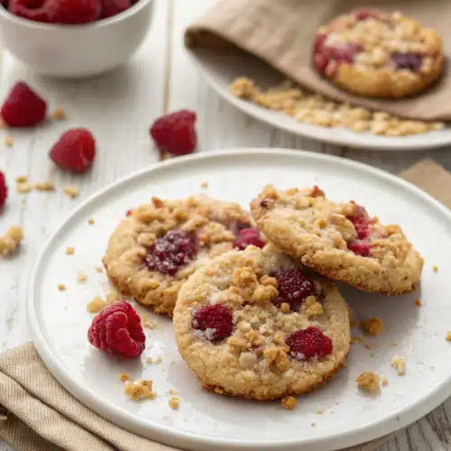 Raspberry Crumble Cookies are soft-edged, chewy-centered treats where a thick layer of fresh or frozen raspberries meets a tender vanilla cookie base, all crowned with a golden, nutty crumble topping. Unlike traditional drop cookies, these are baked in individual portions, which allows each one to develop a little pocket of jammy fruit right in the middle. The crumble isn’t just sprinkled on—it’s pressed gently into the batter so every spoonful delivers both texture and flavor. They’re not overly sweet, which makes the bright tang of raspberries shine through. Plus, because they’re portioned individually, they’re great for gifting or portion control (though we can’t promise how long they’ll last once you try them).