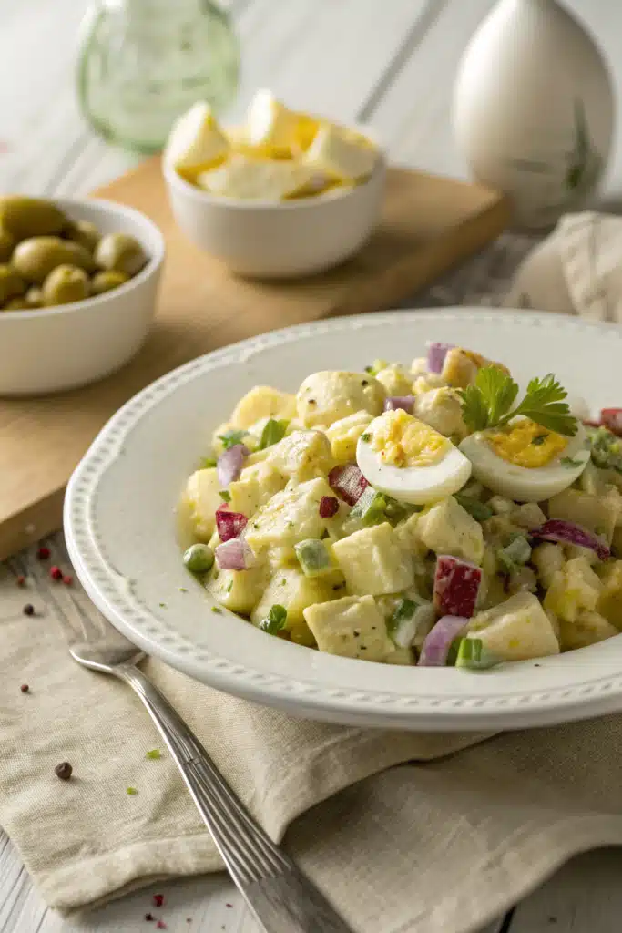 You’ll start by boiling peeled potatoes until fork-tender. While they cool slightly, whisk together the creamy dressing with eggs, herbs, and seasonings. Once the potatoes are chunked, gently fold everything together. Chill for at least two hours (overnight is ideal) so the flavors can develop. Serve cold—never warm. Easy as pie (and honestly, almost as good).