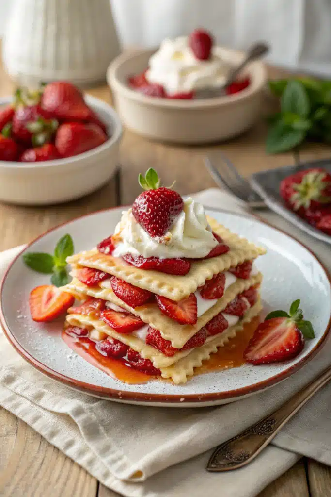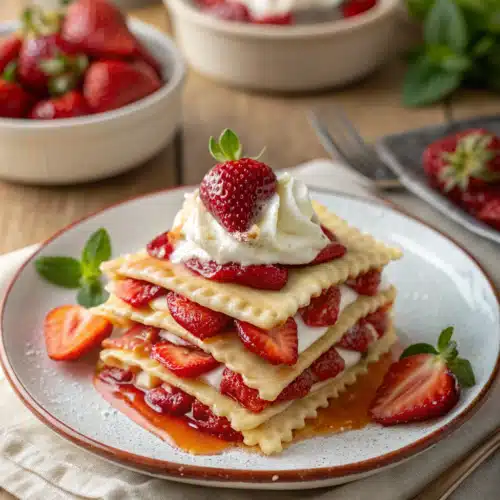 There’s something magical about transforming something familiar—like lasagna—into a new form that surprises and delights. Strawberry lasagna does exactly that: it takes the comforting idea of layered richness and replaces it with airy, fruity elegance. Every time I serve it, someone always asks for the recipe, amazed by how such a simple assembly yields such wow-factor results. It’s proof that sometimes the most beautiful things come from letting nature take the lead—fresh strawberries do all the hard work releasing their essence, while the phyllo simply holds it all together in perfect harmony. Whether you’re celebrating a milestone, welcoming spring, or just needing a moment of joy, this dessert brings warmth and sweetness in equal measure. Give it a try—your taste buds will thank you, and your guests? They’ll remember it long after the plates are empty.