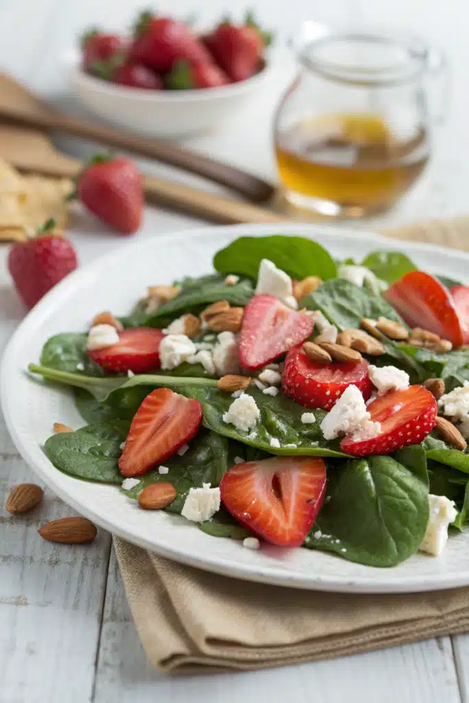 This Strawberry Spinach Salad pairs beautifully with grilled proteins like salmon, chicken breast, or even plant-based options such as marinated tofu. For a complete meal, serve alongside crusty bread or garlic butter rolls—the dressing is divine on warm sourdough. If you’re hosting a picnic or brunch, it’s a stellar companion to quiches, deviled eggs, or fruit platters. Its bright flavors cut through richer dishes, making it a balancing act on any table. I’ve also seen it shine as part of a Mediterranean-themed spread with olives, hummus, and pita chips. Honestly? Almost anything goes—just don’t overpower it with heavy sauces or strong cheeses. Keep the focus on freshness!