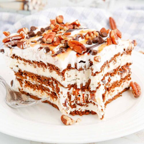 You’ll line a 9×13-inch pan with ice cream sandwiches, add a fluffy layer of Cool Whip, then alternate drizzles of chocolate and caramel sauces with chopped pecans and chocolate chips. Repeat the layers, cover, and freeze for at least 3–4 hours before slicing. That’s it! Total time: under 20 minutes active prep plus freezing.